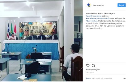 Por sua vez, o corregedor informou o período de recadastramento dos eleitores de Barreirinhas (28 de junho a 1º de dezembro), pedindo que os partidos políticos e as lideranças colaborem com a Justiça Eleitoral, levando os eleitores para realizarem o recadastramento, que ocorrerá de segunda a sexta, das 8h às 18h, no posto de atendimento que funcionará no complexo esportivo do bairro Riacho.